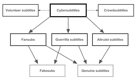The transition from the static to the dynamic internet, the so-called web 2.0, allowed an influx in the production and distribution of material produced by users in attempts to create space for themselves in which to express their ideas, their likes and dislikes. Along with the multiplication of videos, the offer of subtitles on the net, whether solicited in the form of crowdsubtitling, or unsolicited, has also boomed in recent decades. The boundaries among the many types of subtitles are not always clear cut, making their classification a terminological conundrum.