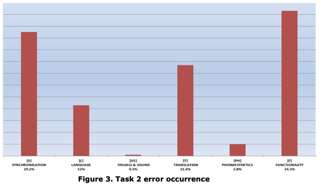 The top three rated errors in Task 2 were functionality (34.3%), synchronisation (29.2%), and translation (21.4%), therefore functionality and translation were common denominators in both tasks, while language issues (12%) were fewer in the second task and were surpassed by synchronisation issues (29.2%). The higher level of difficulty of Task 2 could have contributed to the increase in synchronisation errors. The lack of time pressure, given that they had more time to complete Task 2 compared to Task 1 did not seem to contribute to a better performance.